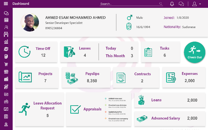 واجهة جذابة شاملة بكافة الخدمات الذاتية المتاحة للموظفين, إمكانية تغيير كلمة المرور, تسجيل الحضور والانصراف, طلبات الإجازات وأذونات العمل المختلفة, إدارة الطلبات والمهام, طلب النفقات، القروض والسلفيات, إدارة العقود وكشوفات الرواتب, إدارة التحديات والتقييمات, إدارة الخطابات والتقارير.